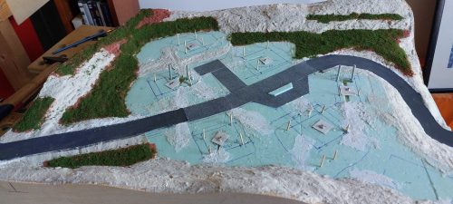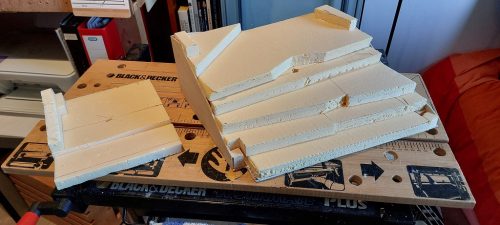 Hierbij heb ik gebruik gemaakt van piepschuim dat in een triplex bak ligt en in vorm wordt gesneden met een hitte draad. Als je het met een mes snijdt levert het heel veel korrels op. Zo’n hittedraad had ik niet zelf zodat ik hem telkens moest lenen wat ik niet echt ideaal vond.