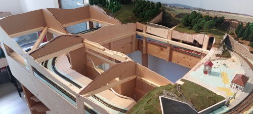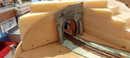 Omdat dit deel van mijn modelbaan nogal breed is heb ik het middendeel als een losse module gemaakt dat als het nodig is verwijderd kan worden. Ook hier is gewerkt met hardschuim en het geheel is op de werkbank gebouwd.